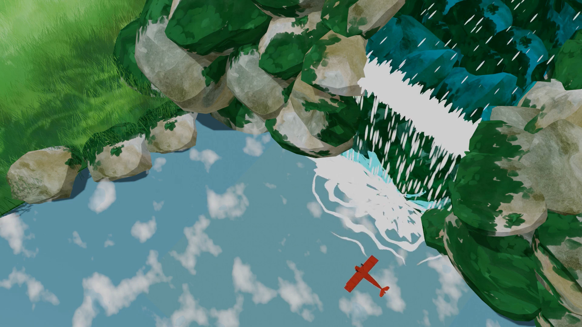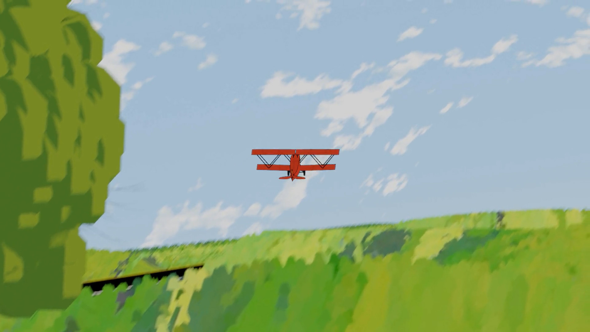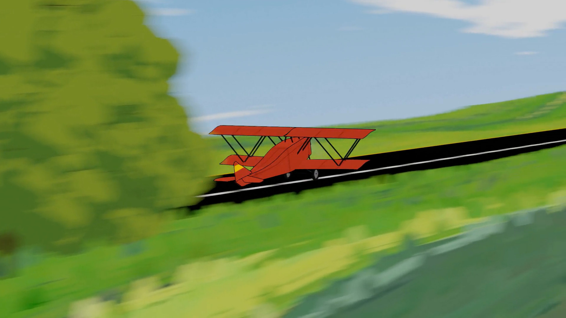 Additionally, I modelled several assets, including trees, clouds, grass… and animated around a third of the scenes, including the whole takeoff sequence, when the plane flies along a road until it reaches the sea, and the loop around the giant cloud near the end.